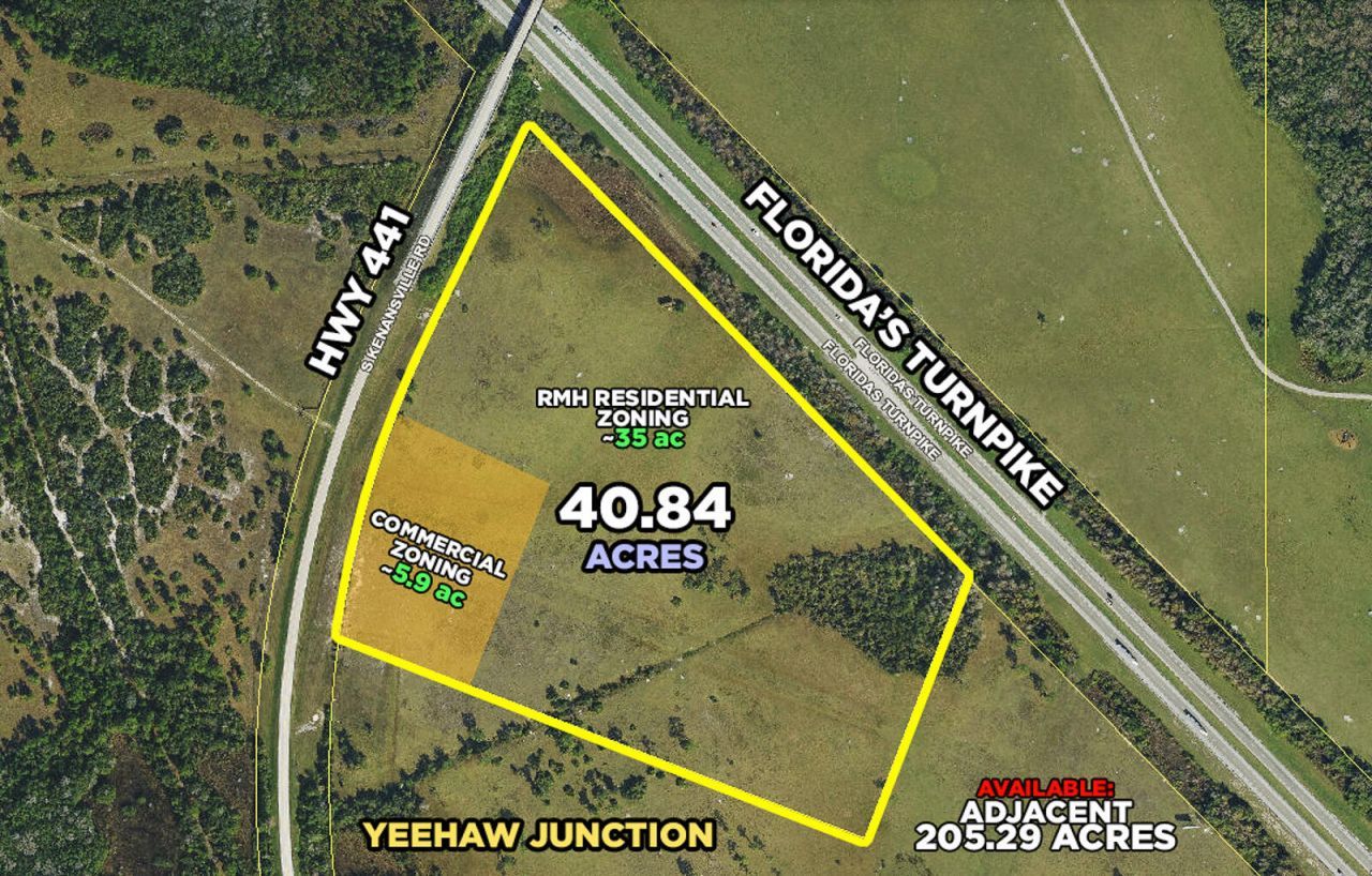 This expansive 40.84-acre property in Okeechobee is located at the Florida Turnpike/State Road 60 exit at Yeehaw Junction-only 30 minutes from Vero Beach and central to all major Florida markets. Currently zoned RMH residential with almost 6 acres of the property approved for commercial future land use. In addition to potential residential development, this property is in a prime location for various industrial and commercial uses such as distribution centers or mixed use. Features 1700 feet of...This expansive 40.84-acre property in Okeechobee is located at the Florida Turnpike/State Road 60 exit at Yeehaw Junction-only 30 minutes from Vero Beach and central to all major Florida markets. Currently zoned RMH residential with almost 6 acres of the property approved for commercial future land use. In addition to potential residential development, this property is in a prime location for various industrial and commercial uses such as distribution centers or mixed use. Features 1700 feet of frontage on the Turnpike with an income-generating billboard and 1700 feet of frontage on US 441/Kenansville Rd. Owned by the same family for over 50 years. The adjacent 205+ acre property is also available for purchase for a potential of 246+ acres combined.