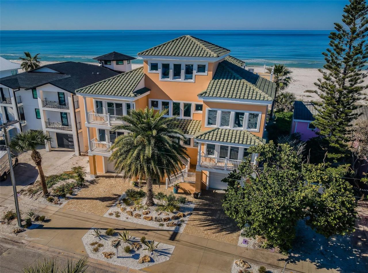 LOCATED DIRECTLY ON THE GORGEOUS WHITE, POWDER-SOFT SANDS OF NORTH CLEARWATER BEACH, THIS DAZZLING 4 BEDROOM, 5 BATH, BEACHFRONT ESTATE PROVIDES AN IMPRESSIVE 8592 TOTAL SQFT UNDER ROOF. Built of all block construction with hurricane impact windows and doors, you will appreciate the sturdy peace of mind this home has to offer. A soaring 20ft-high entry foyer introduces a home with lovely high ceiling and unforgettable views of the Gulf. An inspiring great room plan delivers panoramic views of th...LOCATED DIRECTLY ON THE GORGEOUS WHITE, POWDER-SOFT SANDS OF NORTH CLEARWATER BEACH, THIS DAZZLING 4 BEDROOM, 5 BATH, BEACHFRONT ESTATE PROVIDES AN IMPRESSIVE 8592 TOTAL SQFT UNDER ROOF. Built of all block construction with hurricane impact windows and doors, you will appreciate the sturdy peace of mind this home has to offer. A soaring 20ft-high entry foyer introduces a home with lovely high ceiling and unforgettable views of the Gulf. An inspiring great room plan delivers panoramic views of the beach with terrific custom woodworking and tile/wood finishes. Magnificent18ft-high waterfront living area and separate sitting area with fireplace are supported by a huge luxury wetbar with extensive bar seating. The sumptuous gourmet chef's kitchen boasts elegant granite surfaces, exceptional cabinetry, gas cooking, dedicated beverage chiller, offset undercabinet/counter lighting, and a mammoth island breakfast bar/prep center. Step out to the 450sqft dining/lounging deck and take in sweeping views of the beach/Gulf. The wonderful family room, with towering wood beam vaulted ceilings, is a great space to congregate or get away. The massive owner's suite features fine recessed tray ceilings, superb hardwood flooring, a separate, generously-sized sitting room (with both areas opening to a huge 40ft-wide covered beachfront balcony with 180-degree views of the beach/Gulf), and an expansive his & her walk-in closet system. The owner's bath enjoys its own views of the Gulf and includes exquisite tilework, splendid custom cabinetry, dual vanities, a dedicated cosmetics center and a poshly-appointed walk-in glass shower enclosure. All bedrooms are oversized and en suite, with private balconies, rich closet systems, and lavish full luxury baths. Your spacious lower-level entry area transitions to a dynamic outdoor playground; a 750sqft covered lower-level travertine deck contains a striking dining and lounging area, and a remarkable granite and tumbled-stone outdoor gas cooking center/kitchen with plush seating bar. Beyond the covered deck, discover a travertine deck that encases a stunning, partially-covered heated pool/spa with salt-chlorine conversion system. Your beach front is true bliss; resting well north of Clearwater Beach, you will appreciate the solitary, isolated appeal of this area. Not to be outdone, your deluxe 4-stop elevator will take you to a top-level observation deck with miles of unobstructed views of the Gulf, and the shorelines of Caladesi Island and Honeymoon Island. Gas hot water heating, water softening system, quality window treatments, exceptional wood ceiling finishes, fabulous guest bath with jetted Jacuzzi, spacious laundry with plentiful storage, and many, many extras. This is what Florida Beachfront living is all about! An extraordinary home in a premier, highly-sought-after location. Dimensions are estimates, buyer to verify.
